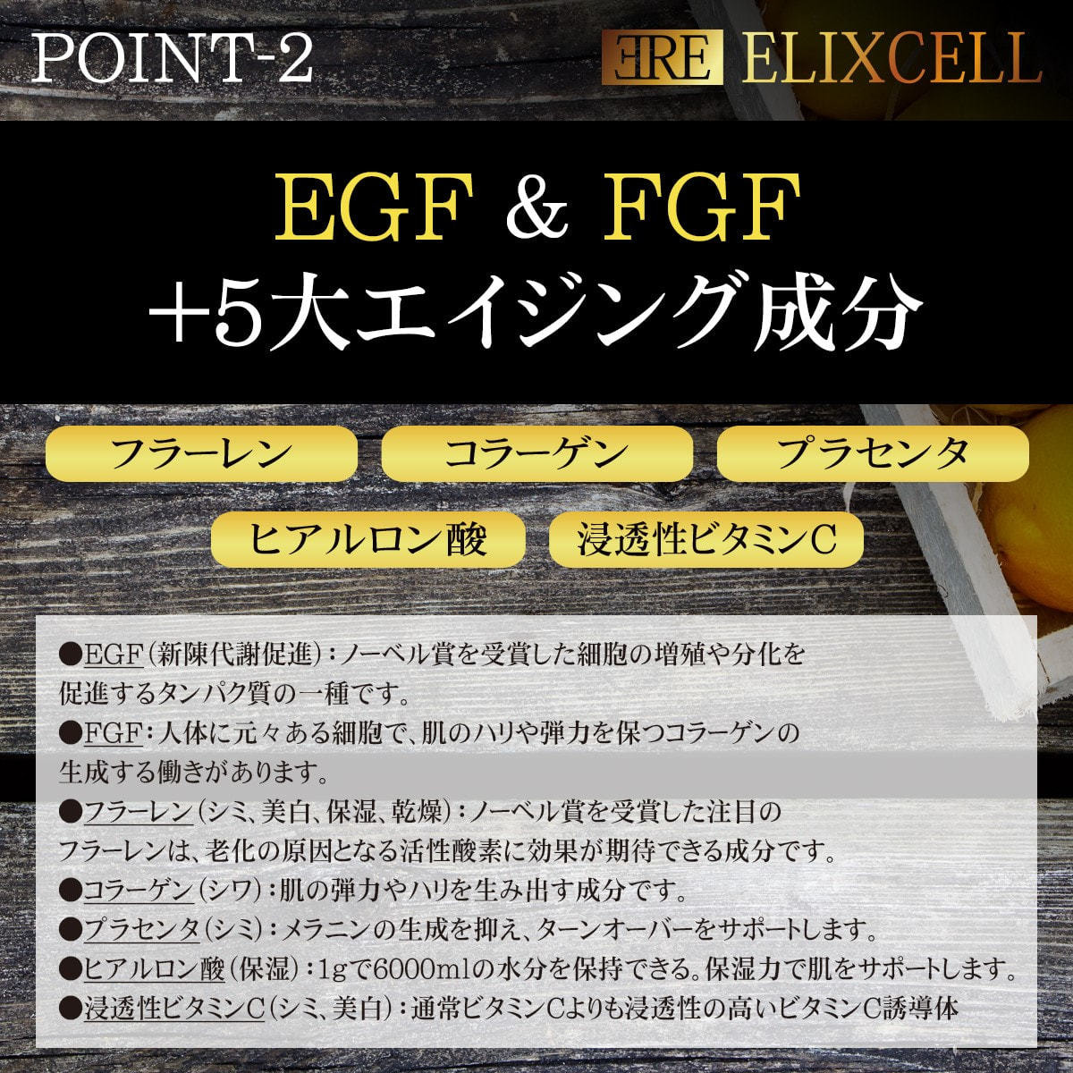 IGF-1:皮膚の老化を遅らせ細胞の再生によるアンチエイジング効果。傷ついた細胞を再生。
